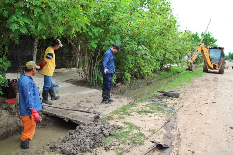 Con una retroexcavadora y un camión volcador para la intervención urbana, el objetivo es garantizar el escurrimiento del agua, evitando de esta manera la acumulación y el consecuente anegamiento de calles.